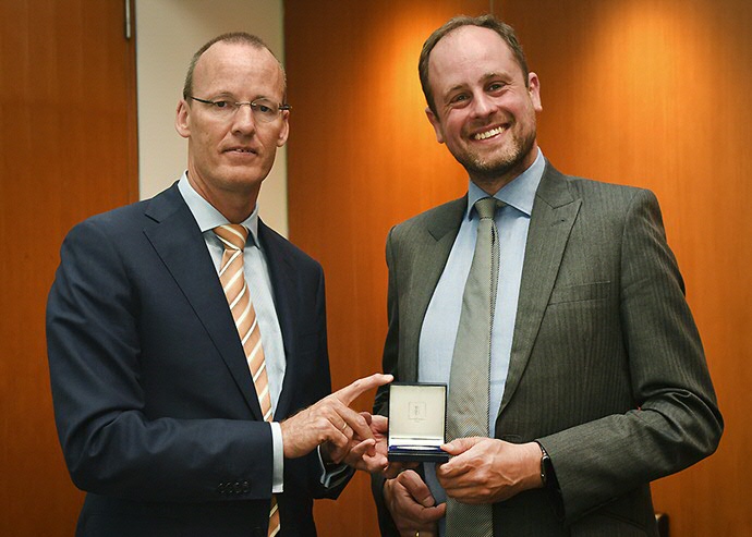 De Willem F. Duisenberg Fellowship Prize 2016 gaat naar RUG-econoom dr. Robert Inklaar voor zijn excellente en originele onderzoek in de toegepaste macro-economie. Inklaar onderzoekt hoe economische groei tot stand komt, en de rol van de financiële sector daarin. Inklaar ontving de prijs, een medaille en 15.000 euro, uit handen van juryvoorzitter Klaas Knot, directeur van De Nederlandsche Bank, en Victor Halberstadt, voorzitter van de Willem F. Duisenberg Stichting.