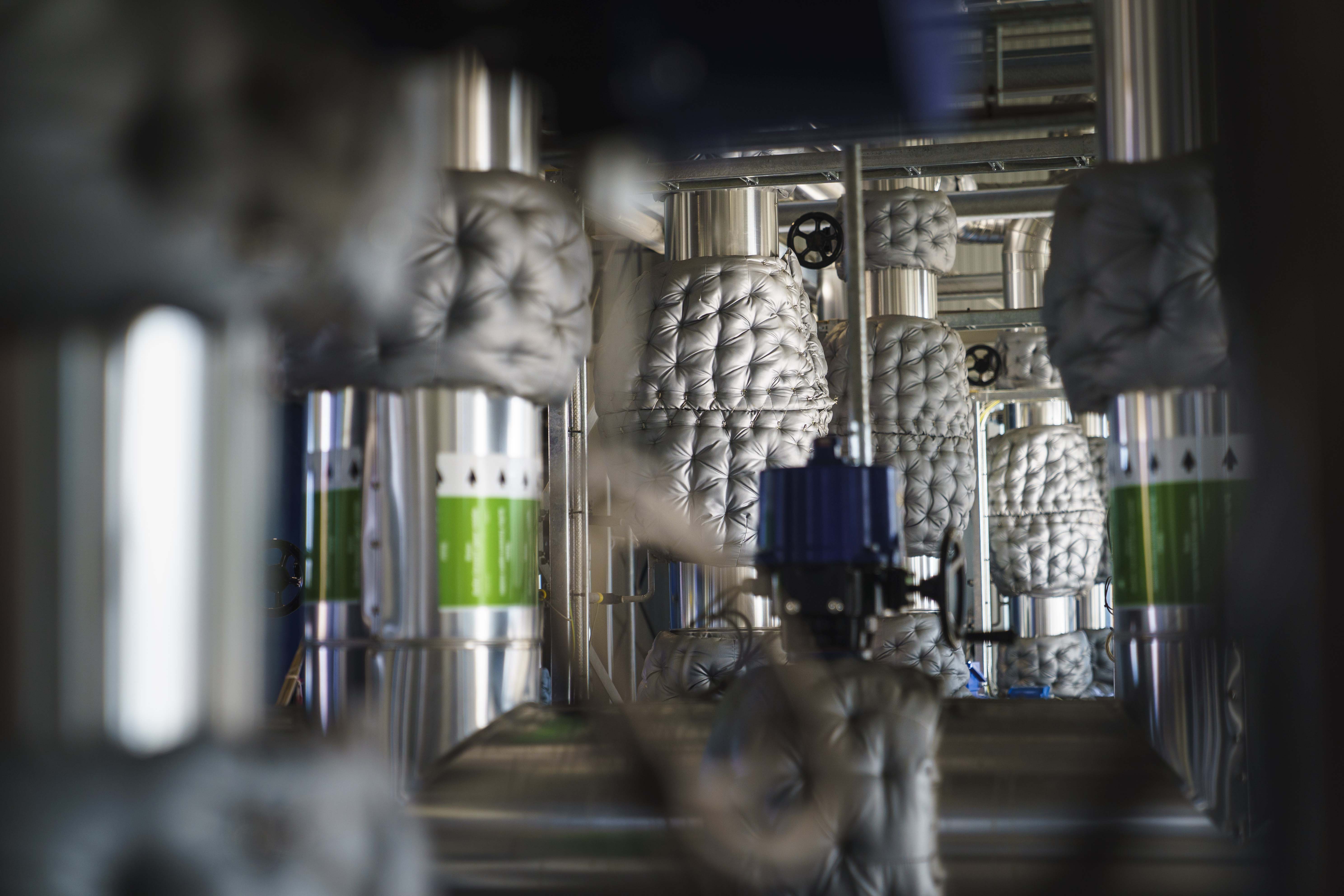 Op de foto’s staat Cucuzzella in een gebouw van Novar, ontwikkelaar en eigenaar van grootschalige groene energiesystemen. In dit gebouw komen pijpen met warm water binnen om vervolgens hun warmte over te dragen aan het warmtenet van WarmteStad, een netwerk van pijpleidingen waarmee zo’n 2600 huishoudens in de stad Groningen hun huis verwarmen, en binnenkort ook verschillende universiteitsgebouwen van de RUG.