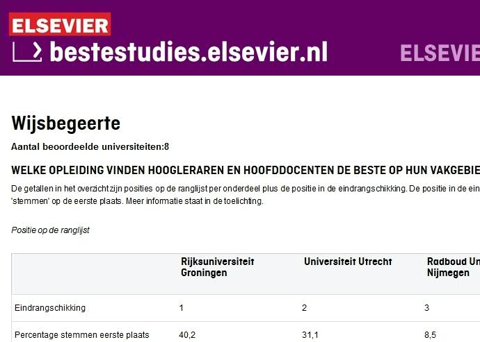 Maar liefst 40,2 procent van hoogleraren en universitair hoofddocenten plaatste onze faculteit op de eerste plaats, ten opzichte van 31,1 procent voor Utrecht, die een tweede plaats behaalde. Elsevier Faculty Rating Wijsbegeerte