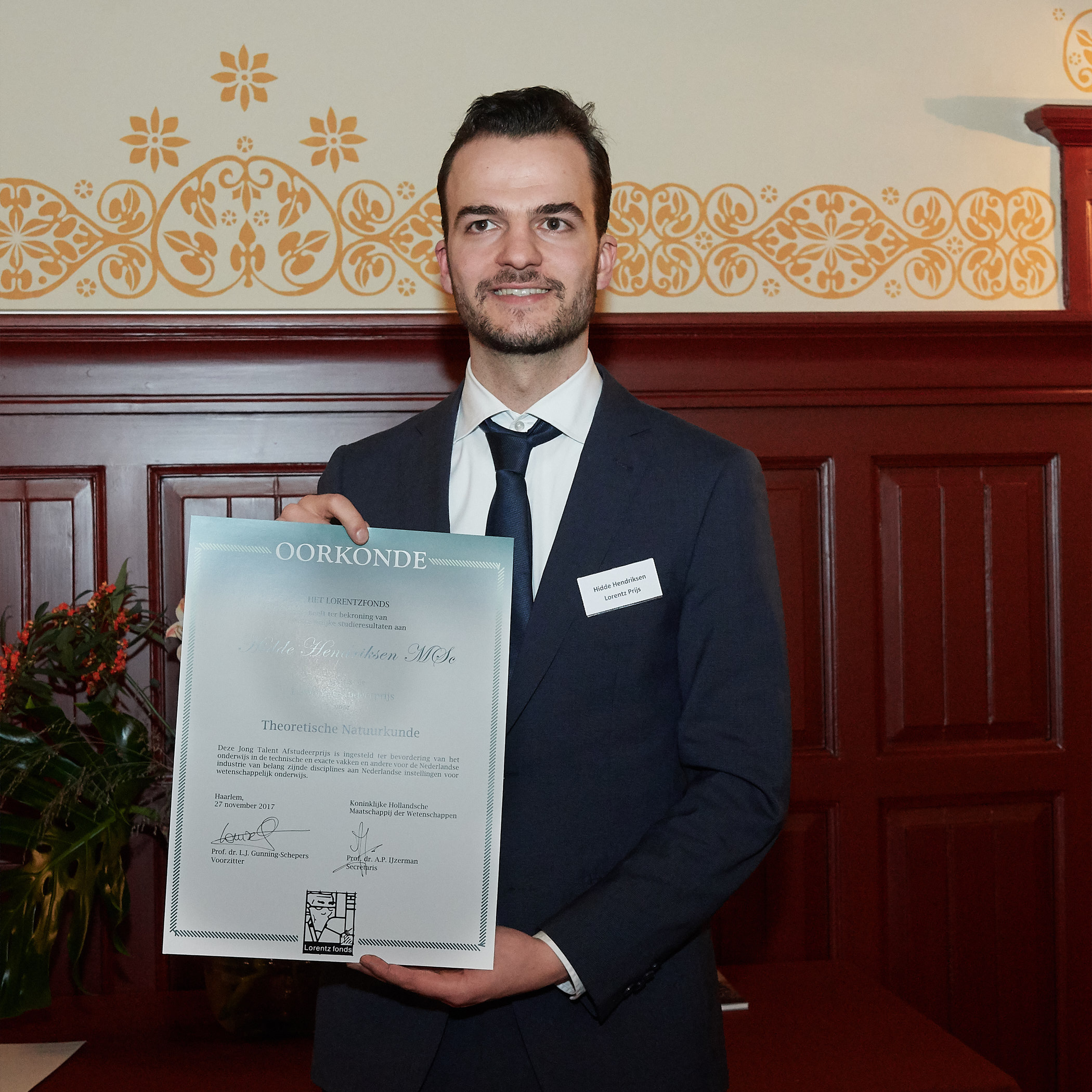 Hidde Hendriksen (Faculty of Science and Engineering) ontvangt op 27 november de Lorentz Afstudeerprijs voor theoretische natuurkunde van 3.000 Euro bij de Koninklijke Hollandsche Maatschappij der Wetenschappen (KHMW) te Haarlem. Hendriksen deed onderzoek naar elementaire deeltjes, de kleinste bouwsteentjes van materie. Hij bestudeerde een alternatief model voor de Higgssector, een onderdeel in het Standaard Model voor Deeltjesfysica.