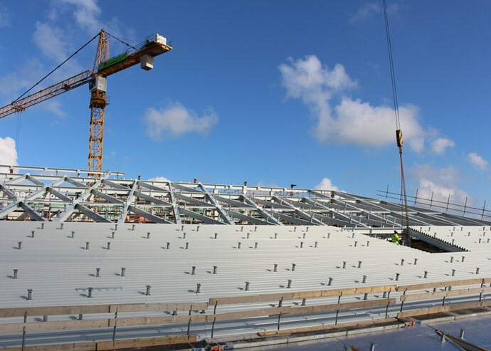 De laatste delen van de dakconstructie wordt geplaatst op de nieuwbouw Energy Academy Europe.