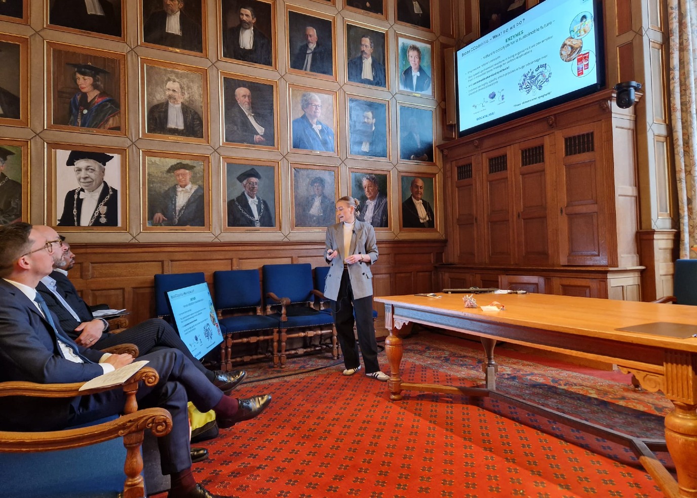Na een diner op woensdagavond, waarbij onder meer RUG-collegevoorzitter Jouke de Vries aanwezig was, stonden donderdagmorgen verschillende presentaties op het programma. Prof. dr. Sandy Schmidt van de faculteit Science and Engineering vertelde over het Europese project BiodeCCodiNNg. Centraal in dit onderzoeksproject staan enzymen en het vinden van duurzame biologische alternatieven voor traditionele katalyse.