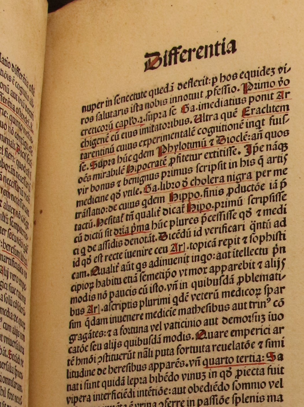 Diversiteit komt ook voor tussen verschillende exemplaren van dezelfde druk. In dit geval is de oorzaak meestal het opgedeelde productieproces. Hoewel in sommige gevallen het volledige productieproces in het atelier van de drukker plaatsvond, was dat lang niet altijd het geval. Het kwam vaak voor dat na het drukken de losse katernen werden opgestuurd naar de nieuwe eigenaar. Hij liet vervolgens decoraties en rubricaties aanbrengen en de katernen inbinden. In deze processen ben ik regionale verschillen tegengekomen, waarbij exemplaren van een incunabel van dezelfde drukker, uit hetzelfde jaar en met dezelfde hoofdtekst er totaal anders kunnen uitzien. Om dit opgedeelde productieproces te illustreren heb ik steeds twee exemplaren van hetzelfde werk vergeleken. Illustraties 5 en 6 illustreren het verschil dat kan ontstaan door de decoratie. Op ill. 5 zien we het exemplaar uit Groningen van Cicero’s De Oratore gedrukt door Wendelinus van Spira in Venetië (1470) en op ill. 6 zien we het exemplaar van de Bayerische Staatsbibliothek. Op ill. 7 en 8 zien we een verschil in de rubricatie van het werk tussen het exemplaar uit Groningen (ill. 7) en het exemplaar van de Bayerische Staatsbibliothek (ill. 8) van het eerder genoemde werk van Petrus de Abano. Ten slotte zien we op ill. 9 (Groninger exemplaar) en ill. 10 (exemplaar Bayerische Staatsbibliothek) dat ook de band waarin een incunabel werd ingebonden (in dit geval de eerder genoemde Articella) sterk kon verschillen; beide banden stammen uit de vijftiende eeuw.