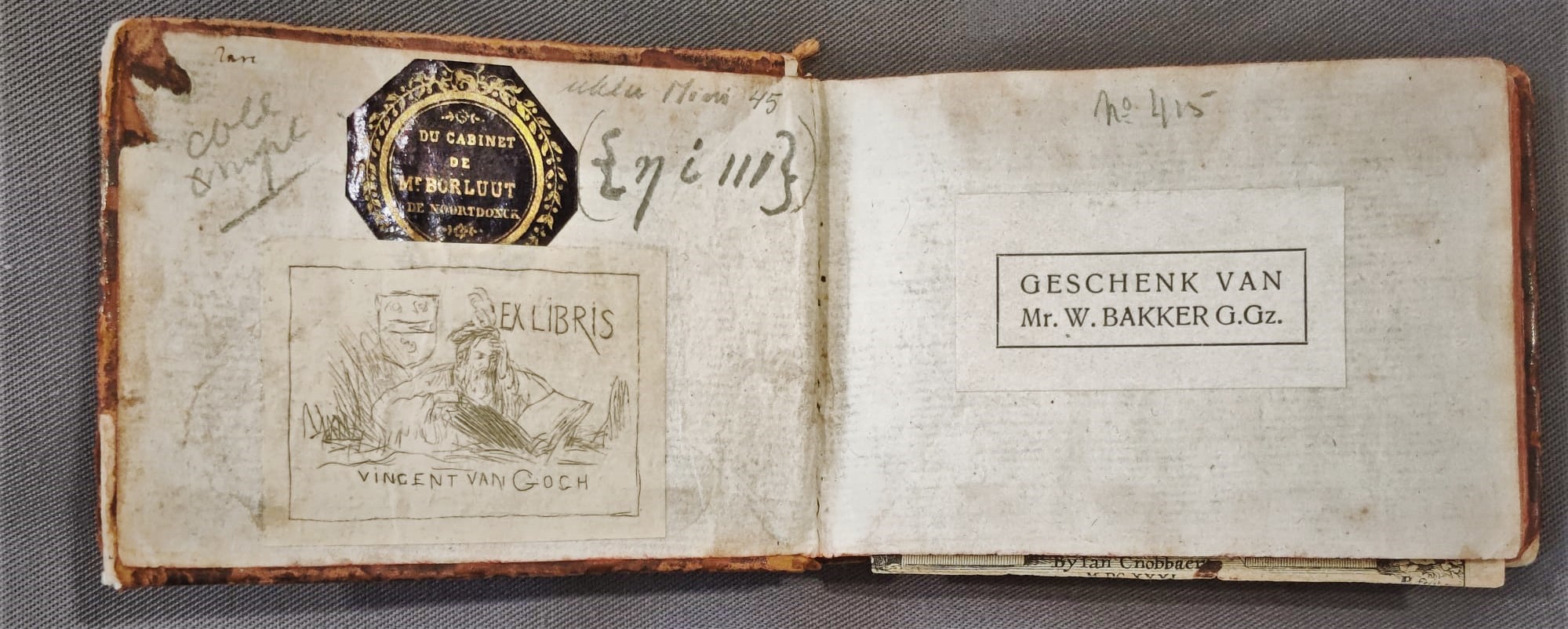 Een van de boeken uit deze emblematacollectie heeft een wel heel opvallende voorgeschiedenis. Op de binnenzijde van het voorplat van een emblematabundel genaamd De Ghebreken der tonghe, en de middelen om die te verbeteren van Anton van Bourgoingne staat links naast het eigendomskenmerk van Bakker een ex libris van Vincent van Gogh! Het is een betrekkelijk kleine gegraveerde ex libris met daarop een lezende man en linksboven het familiewapen van Van Gogh. Aan de onderzijde van het ex libris staat met handgeschreven letter zijn naam: Vincent van Gogh. Zou het boekje echt uit het bezit komen van de beroemde schilder?