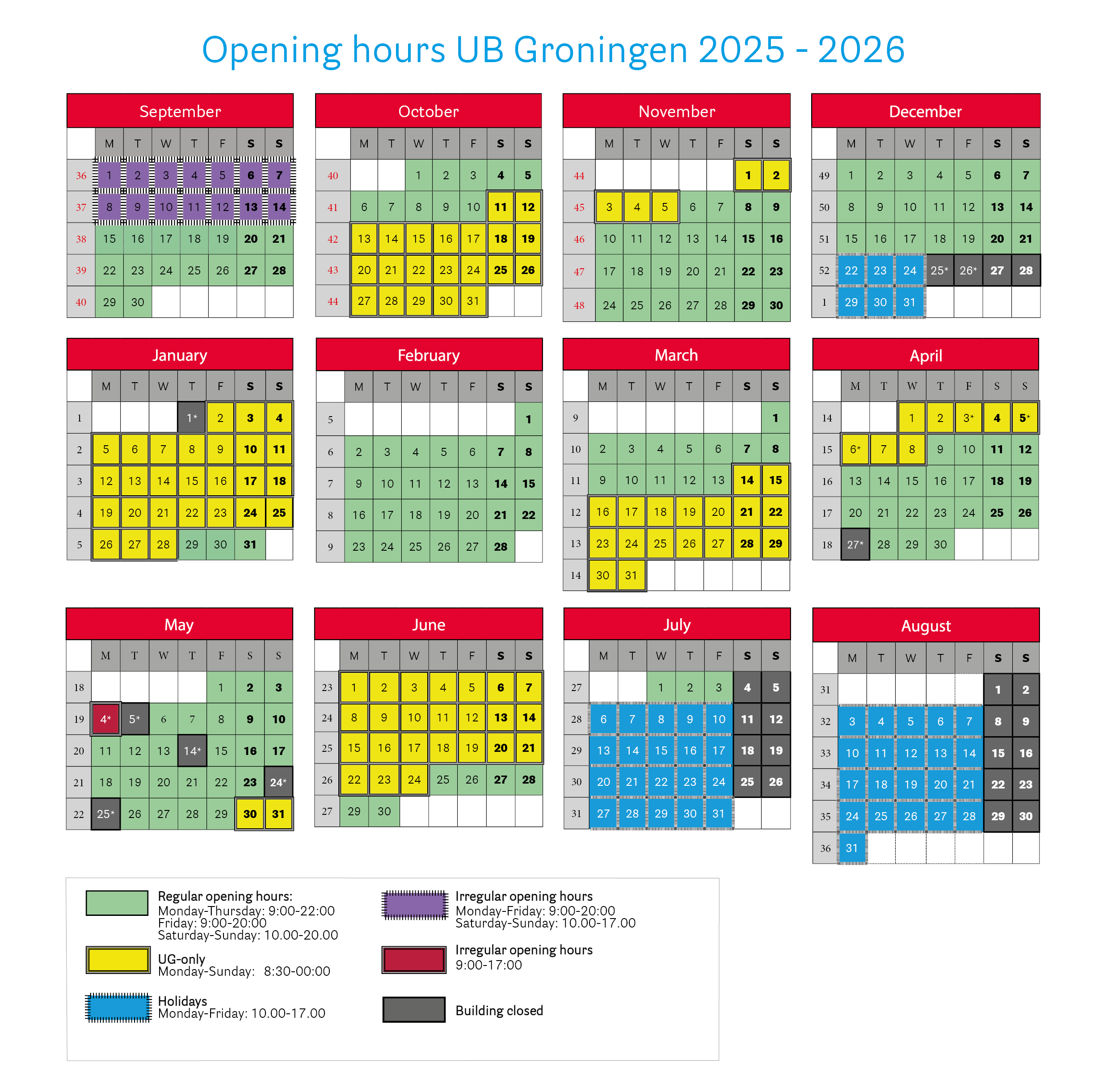 * Openingstijden kunnen afwijken tijdens vakanties en feestdagen, zie jaaroverzicht (klik om te vergroten)