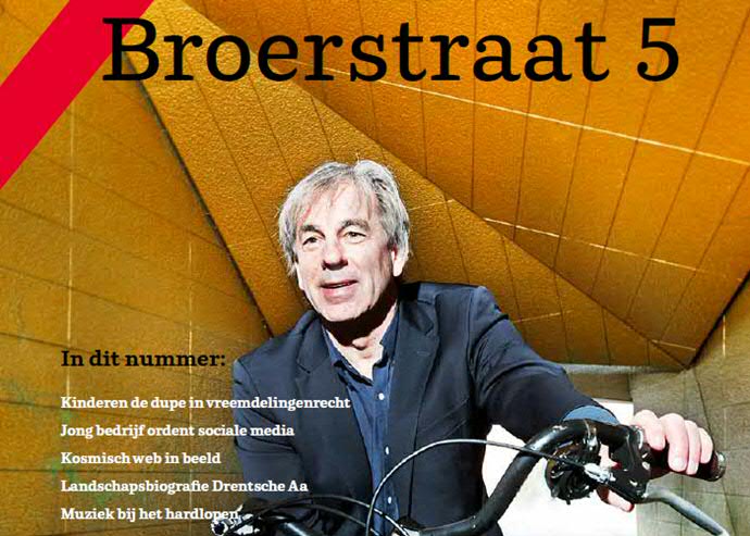 Het aprilnummer van het RUG-magazine Broerstraat 5 opent met een interview met alumnus en raswetenschapper Bert Meijer, die in december uit protest uit het bestuur van NWO stapte. Hij ziet donkere wolken komen aandrijven boven het academische landschap. Verder constateert jurist en pedagoog Margrite Kalverboer dat in het migratierecht de belangen van kinderen worden verwaarloosd, legt alumnus alfa-informatica Edwin Kuipers uit hoe zijn ‘booming’ internetbedrijf orde schept in de sociale-mediabrij en vertelt diamantair Edward Asscher over zijn bedrijf en zijn strijd tegen bloeddiamanten.