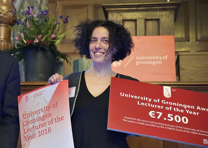 Dr. Malvina Nissim is gekozen tot RUG Docent van het Jaar 2016. De universitair docent computationele taalkunde aan de Faculteit der Letteren won zowel de juryprijs tijdens de Dag van het Onderwijs. Juryvoorzitter prof.dr. Hans van Ees roemde Nissims enthousiaste, interactieve en energieke manier van doceren. Volgens van Ees zijn haar colleges zowel spannend als analytisch en maken ze nieuwsgierig. Dr. Nissim ontving een bedrag van € 7.500, beschikbaar gesteld door het COWOG-fonds, een kunstwerk en een uitnodiging voor het ontwikkelen en verzorgen van een onderwijsmodule voor het Honours College.