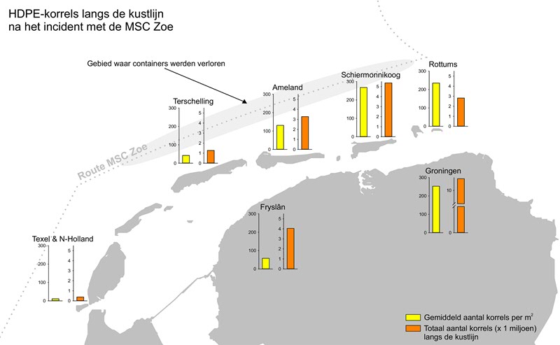 Begin januari lanceerden onderzoekers van de Rijksuniversiteit Groningen (RUG) de webapp Waddenplastic.nl om samen, met iedereen die maar wil helpen, in kaart te brengen waar en hoeveel kleine plastic korrels zijn aangespoeld nadat de MSC Zoe ca. 345 containers verloor op de Noordzee. Na ruim twee maanden laten de resultaten nu zien dat de hoogste concentraties microplastic op het Noordzeestrand van Schiermonnikoog liggen, gevolgd door de Groningse Waddenkust en de stranden van de onbewoonde Rottums. Op Schiermonnikoog wordt volgende week begonnen met het opruimen van de korrels.