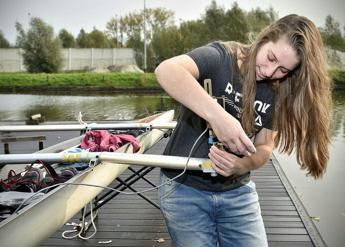 In her research, Cuijpers investigated whether this is indeed the case and whether crews can actually perform the unconventional pattern in practice. She conducted her research both in the lab and on the water. In the lab, she used ergometers connected by slides to simulate the movements of a ‘boat’ on water; on the water, she measured the crews using a self-developed measuring system.