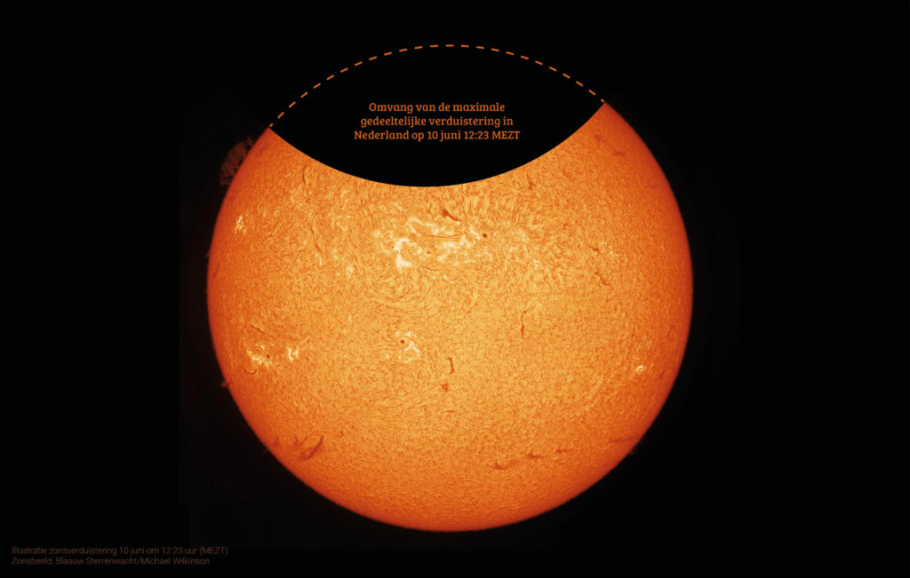 Donderdag 10 juni is er een gedeeltelijke zonsverduistering (eclips) in Nederland. De verduistering begint om 11.21 uur, het maximum is om 12.27 uur en om 13.36 uur is de eclips voorbij. De eerstvolgende is dan weer op 25 oktober 2022.