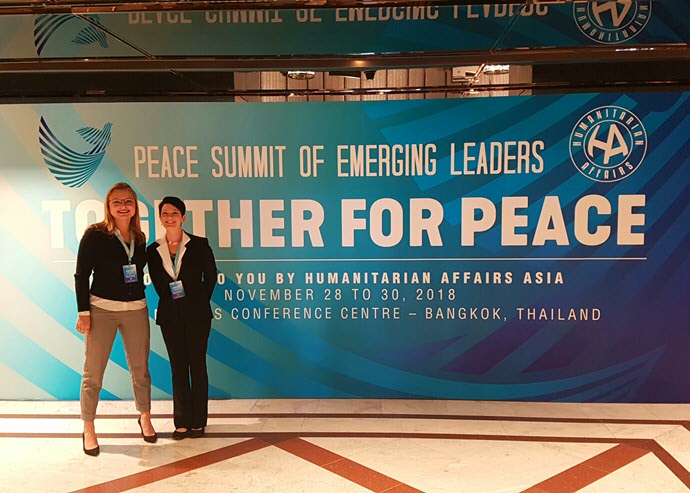 Students Vicki Collinge (MA Religion, Conflict and Globalization) and Marieke Klijnstra (BA Religious Studies) represented the University of Groningen at the UN Peace Summit of Emerging Leaders in Bangkok, 28 - 30 November 2018. This three-day conference was organized by Humanitarian Affairs Asia. Some 350 potential Peace Ambassadors learned about Peacebuilding and issues of conflict through the personal testimony of first-hand survivors.