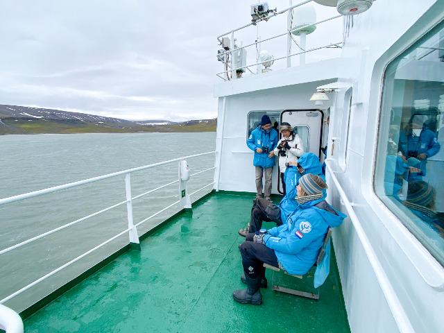 The span of research projects carried out on board and the variety of methods is overwhelming. People measure air pollution and black carbon, take water samples both from the ocean and fresh water, study vegetation and food chains of fish and large mammals, count birds, collect sea weed, investigate archeological sites, reconstruct history, observe human interaction, and more. Among the Arctic Academy participants, there are many with scientific background and all with genuine interest in science, eager to get involved. When the fog thickens and it becomes clear that the whole Thursday will be spent on board, both due to polar bear safety and a strong swell making landing with the zodiac impossible, the passengers of Ortelius bear it with patience. This is how it works on polar expeditions - you plan and prepare the best you can, and then you take it as it comes.